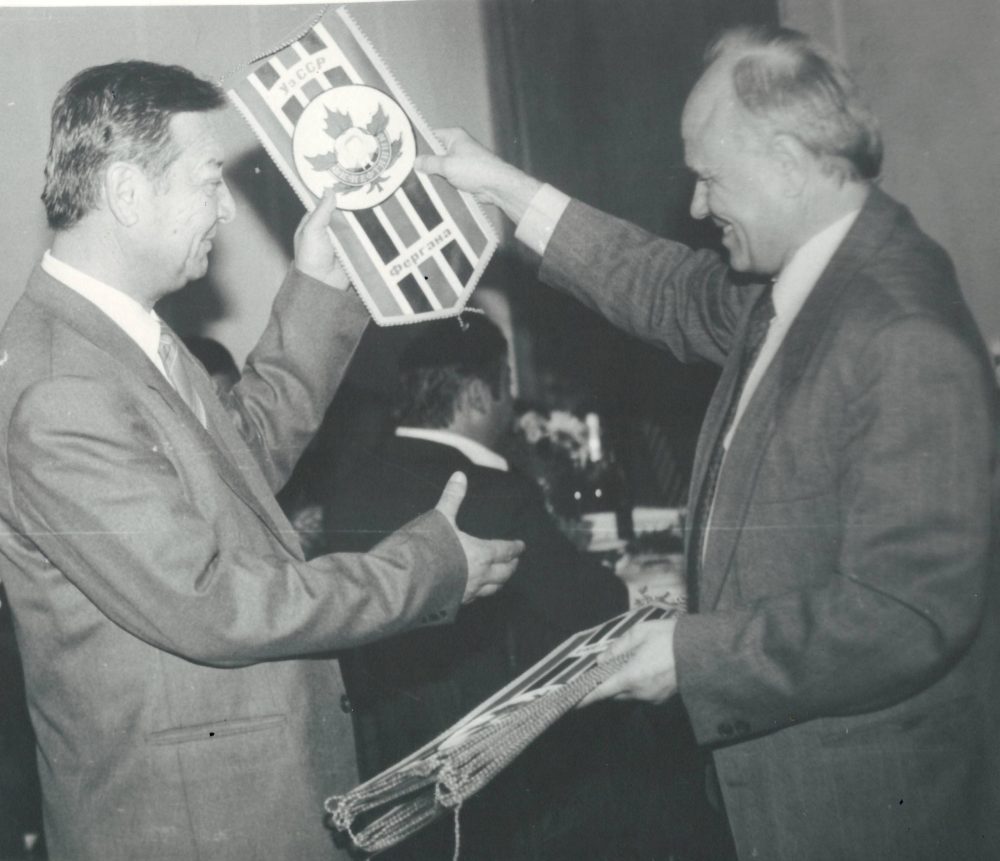 Лев Викторович Вахтин Фарғона пахта тозалаш заводи директори Анваржон Давидбоевга жамоа рамзини топшираётган жараёндан лавҳа